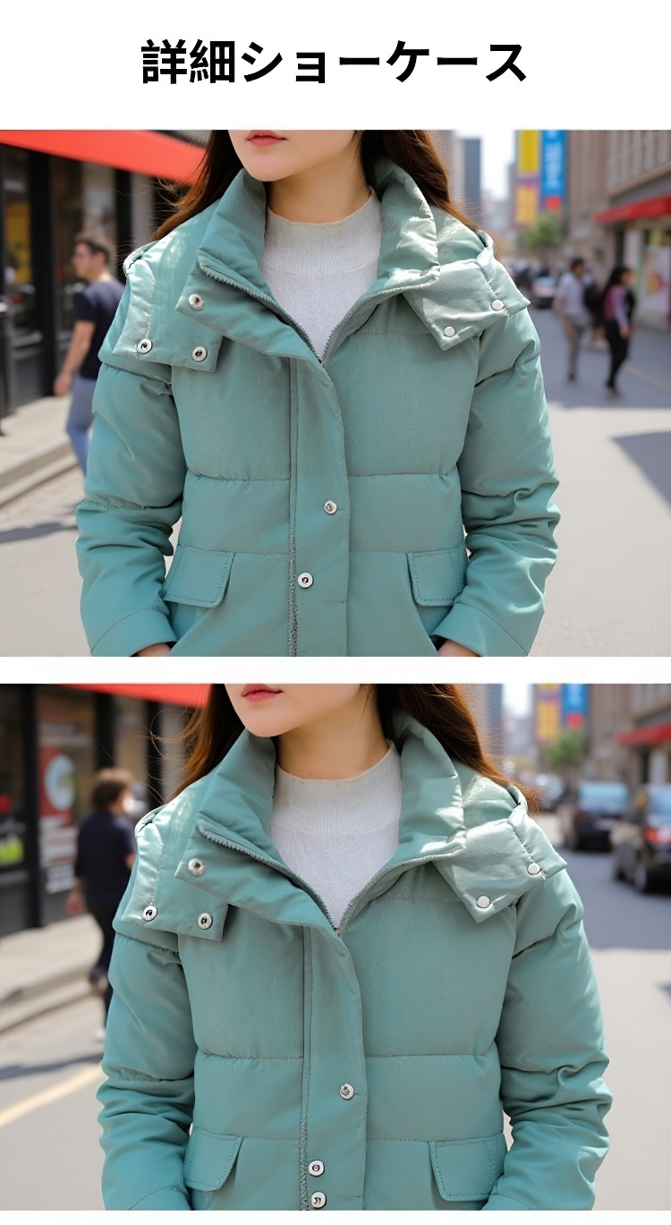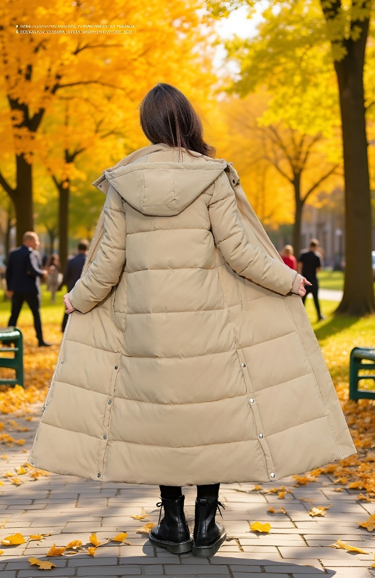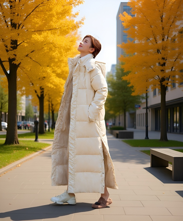 女性モデル着用羽绒棉服超長款イメージ